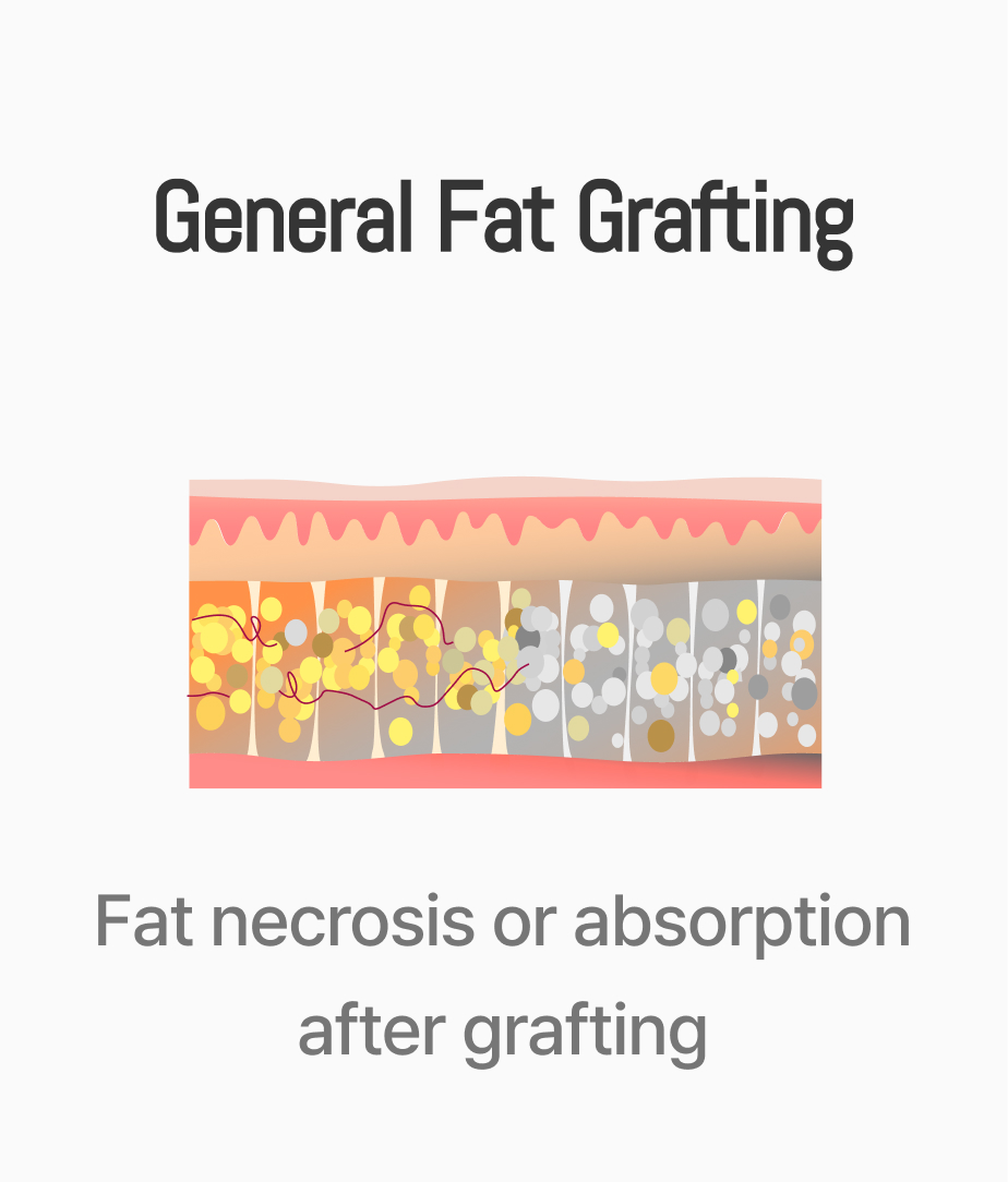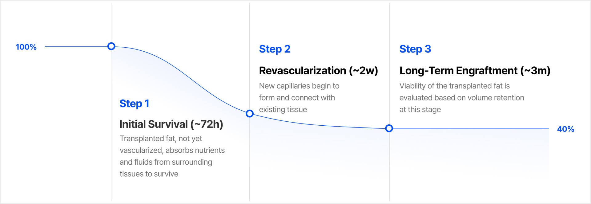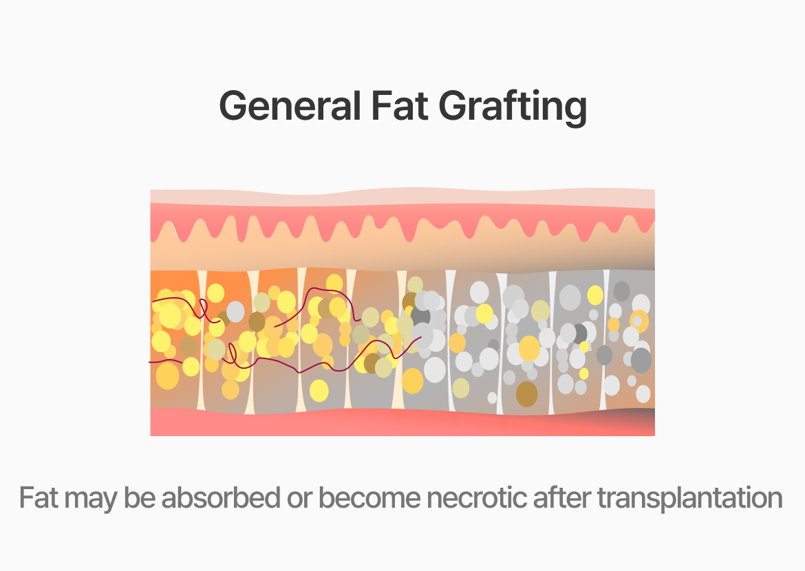 Fat cells that fail to connect to blood vessels will either be reabsorbed or die, resulting in volume loss, irregular texture, or uneven contours