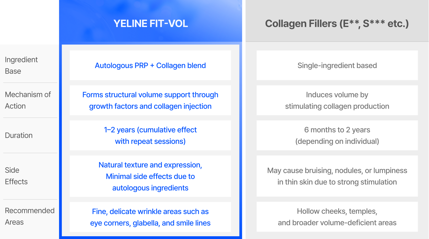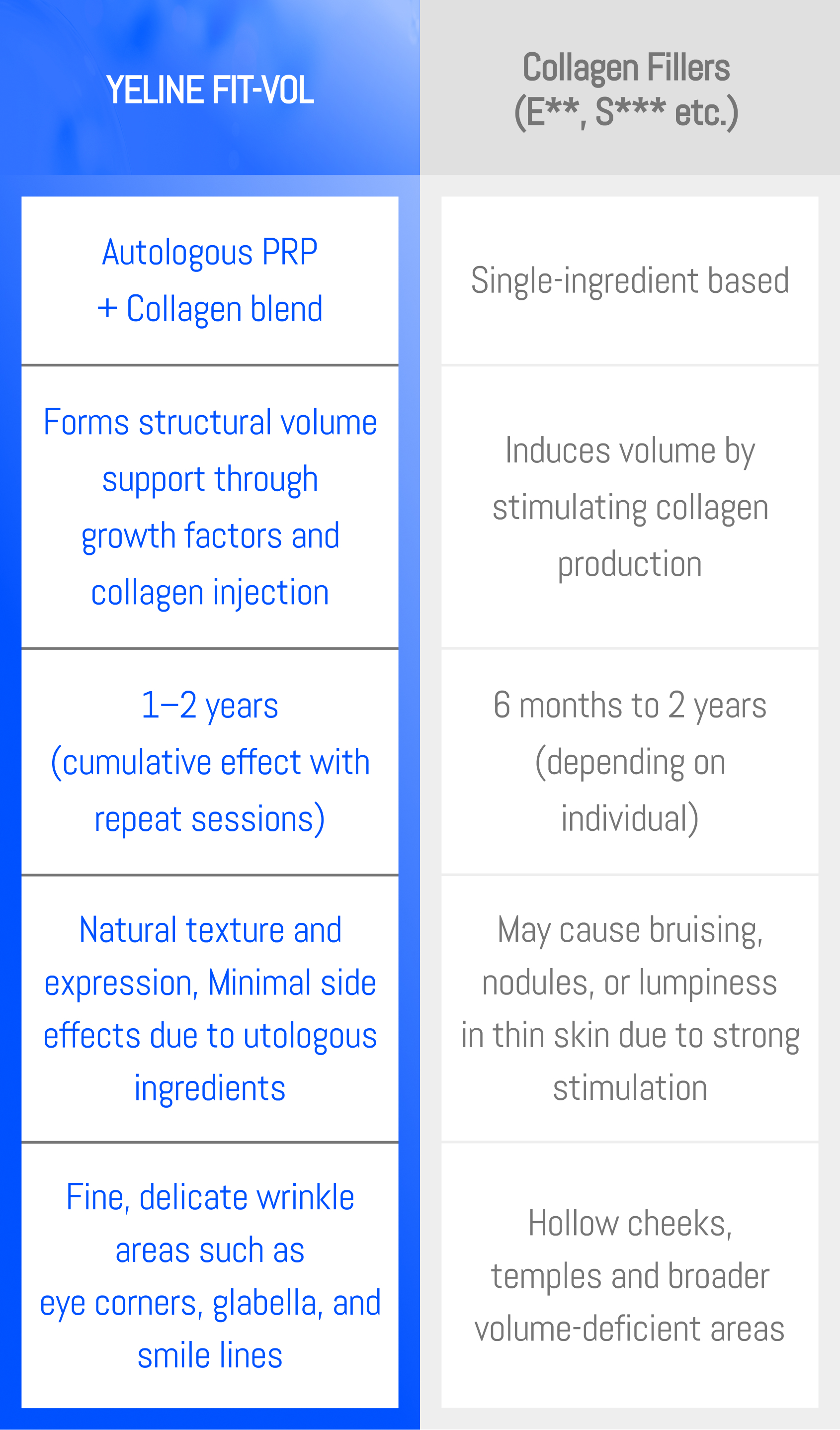 This formulation combines PRP with high-molecular ingredients that stimulate collagen directly. It promotes stem cell activation, immune regulation, and collagen regeneration all at once, helping the skin naturally recover elasticity and volume beyond simple filling